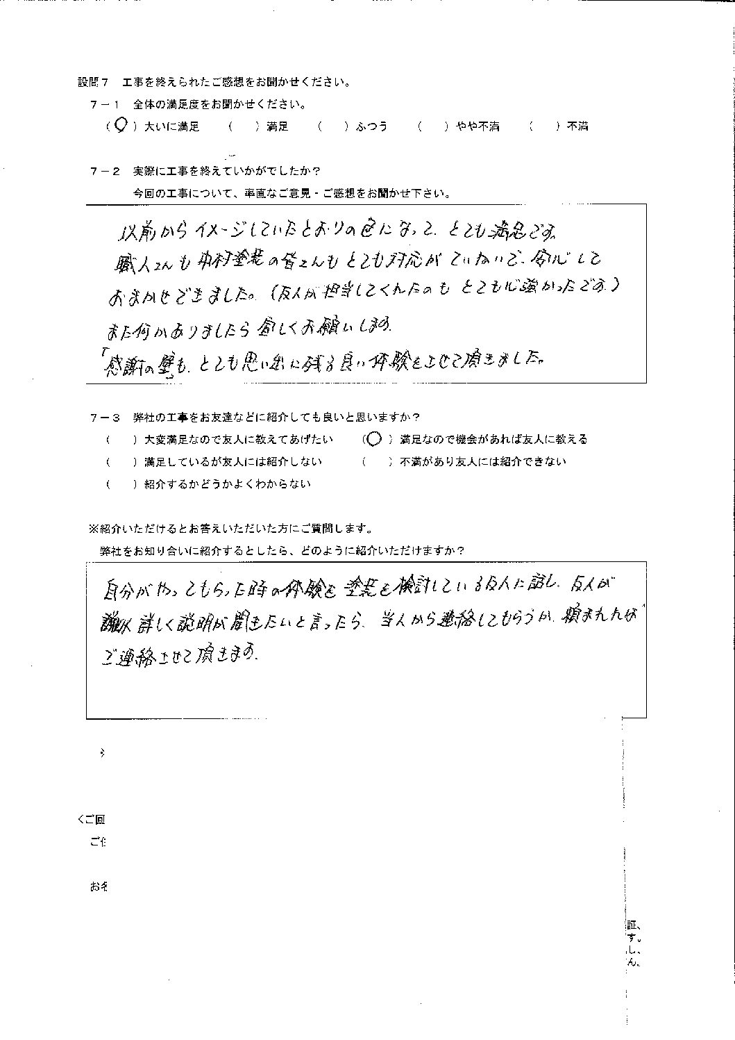以前からイメージしていたとおりの色になって、とても満足です。 職人さんも中村塗装の皆さんもとても対応がていねいで、安心しておまかせできました。 (友人が担当してくれたのもとても心強かったです) また何かありましたら宜しくお願いします。 「感謝の壁」もとても思い出に残る良い体験をさせて頂きました。