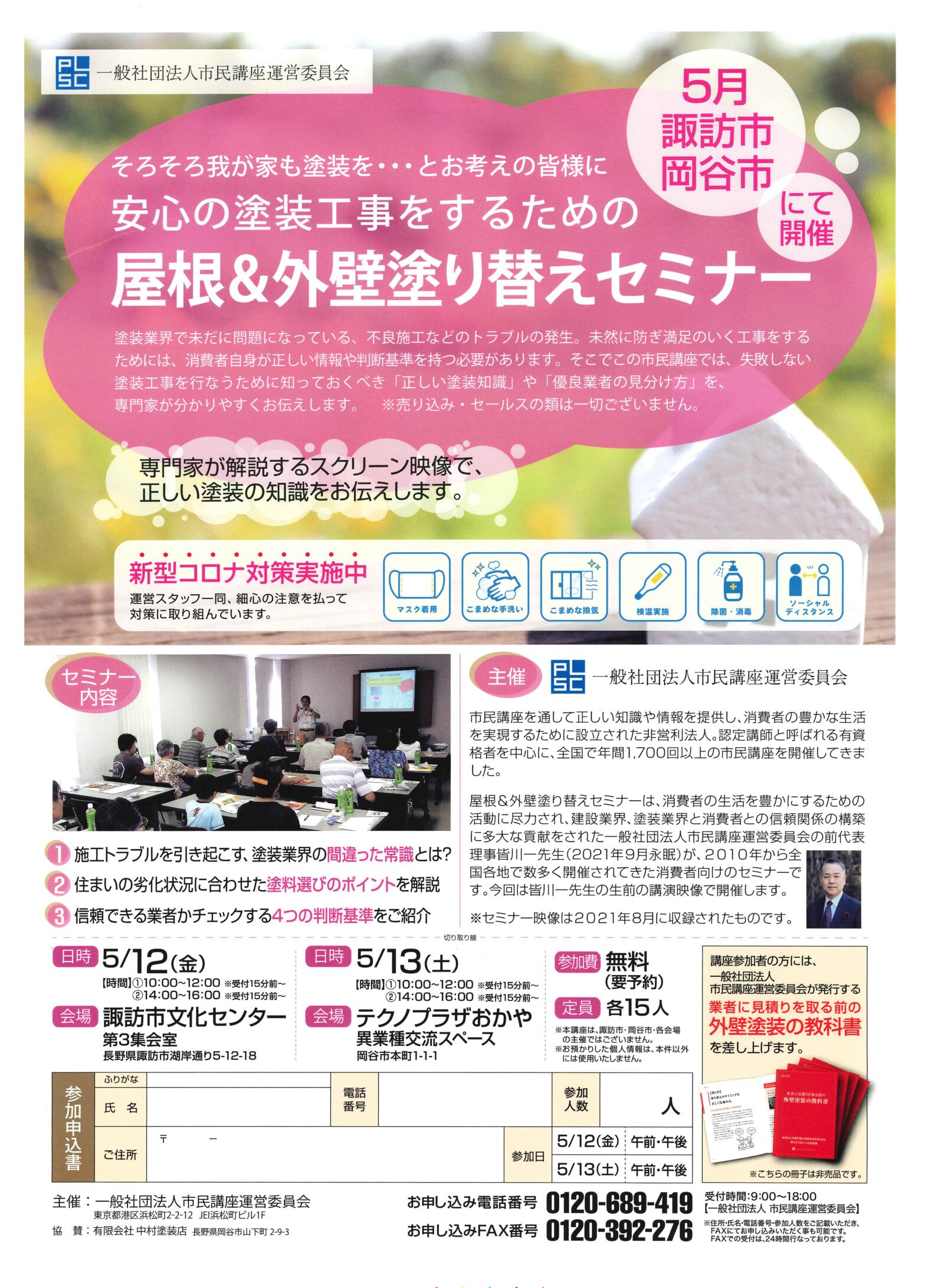 塗装業界で未だに問題になっている、不良施工などのトラブル発生。未然に防ぎ満足いく工事をするためには、消費者自身が正しい情報や判断基準を持つ必要があります。そこで市民講座では、失敗しない塗装工事を行うために知っておくべき「正しい塗装知識」や「優良業者の見分け方」を専門家が分かりやすくお伝えします。※売り込み・セールスの類は一切ございません。