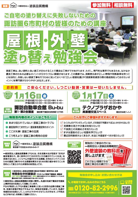 【岡谷市:テクノプラザおかや 異業種交流スペース】屋根&外壁 塗り替え勉強会 1/17午前の部(受付9:45~)10:00∼12:00