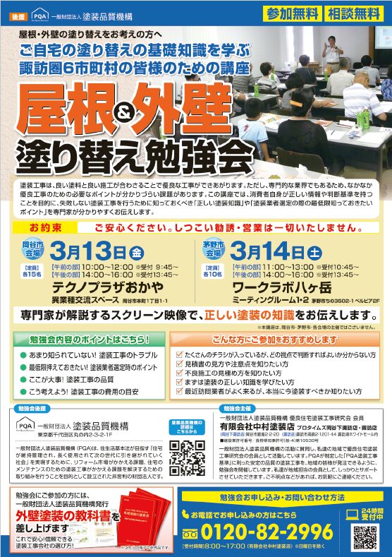 【岡谷市:テクノプラザおかや 異業種交流スペース】屋根&外壁 塗り替え勉強会 3/13午前の部(受付9:45~)10:00~12:00